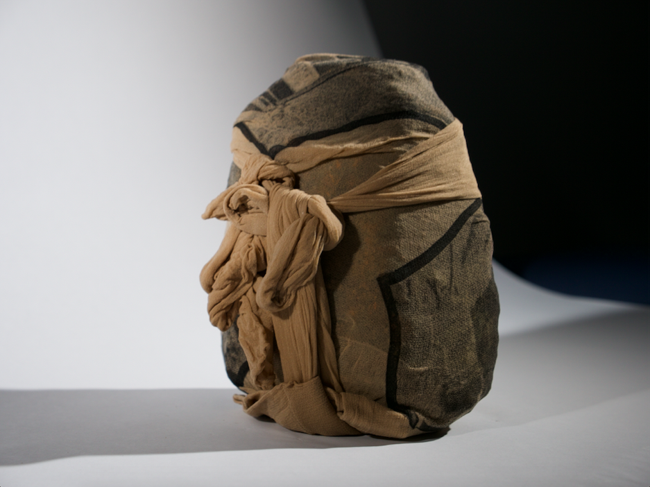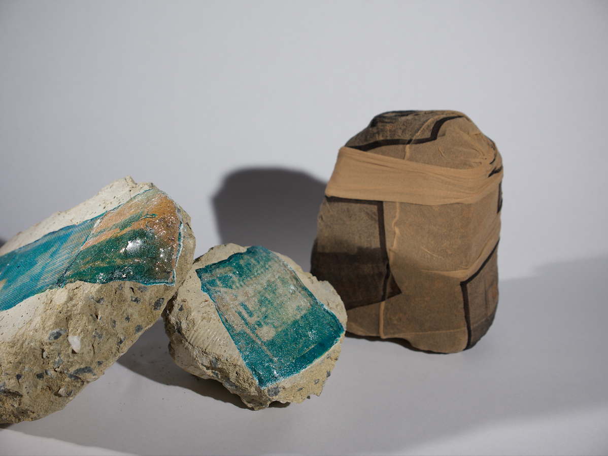 Lucinda Sheardown, Featureless Rocks, 2025. Found rocks, plaster of Paris, cement, polaroid emulsion, stockings, ink, rubble. Dimensions variable